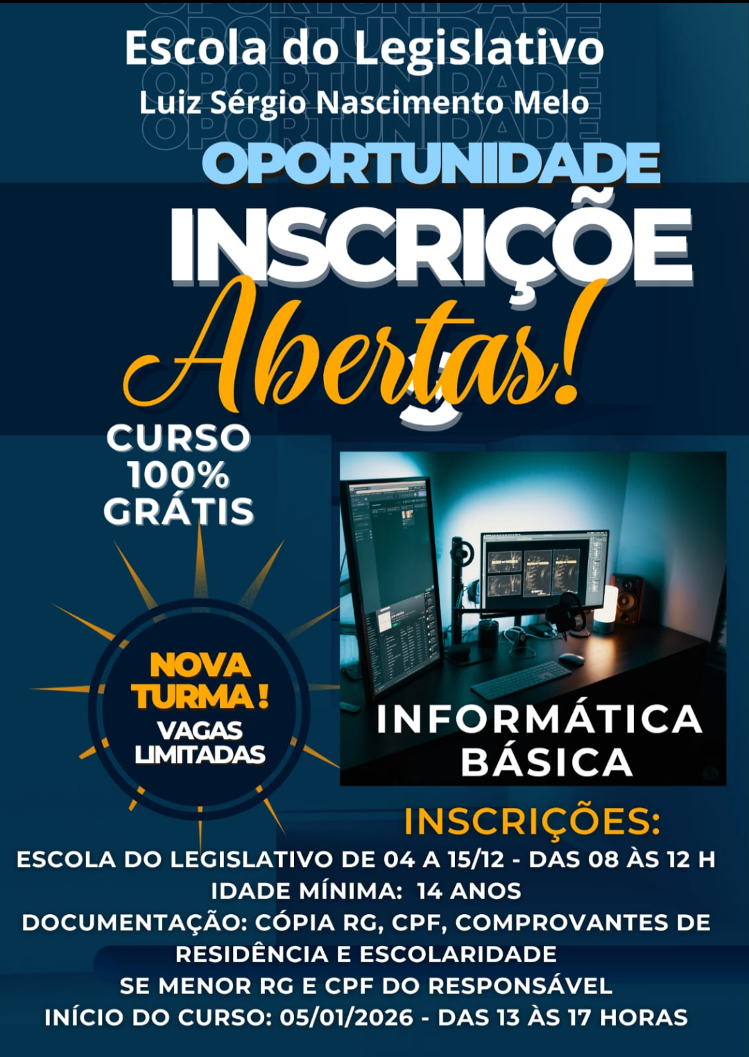 A Escola do Legislativo Vereador Luiz Sérgio Nascimento Melo, de Estância, abre inscrições, nessa quinta-feira, dia 04 de dezembro, para mais um Curso de Informática Básica.