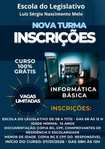 As inscrições são realizadas na Escola do Legislativo, de segunda a sexta, das 08h às 12h, até 04/04 ou enquanto houver vagas. Não perca essa chance de impulsionar seu futuro digital!