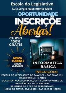 As inscrições são realizadas na Escola do Legislativo, de segunda a sexta, das 08h às 12h, até 04/04 ou enquanto houver vagas. Não perca essa chance de impulsionar seu futuro digital!
